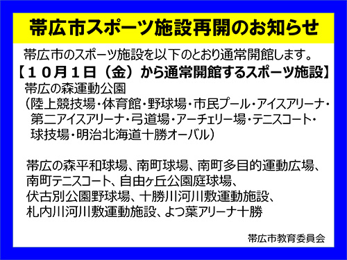 帯広市文化スポーツ振興財団は、臨時休館中の各施設につきまして、101日(金)より再開させていただきます。