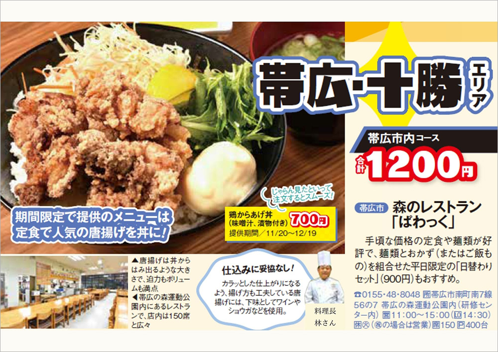 【期間限定】じゃらん×帯広の森研修センター、じゃらん掲載特別メニュー投稿日: 2025年11月20日2025年11月20日カテゴリー帯広の森研修センター じゃらん×帯広の森研修センター、じゃらん掲載特別メニューとして11月20日(木)~12月19日(金)まで期間限定で「鶏からあげ丼」を販売します。 【期間限定】じゃらん掲載特別メニュー 価格:700円 鶏のからあげ丼 味噌汁 たくあん
