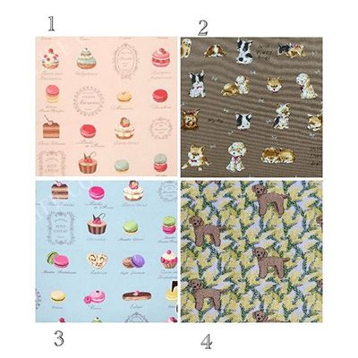 - (1)ピンクの生地にケーキやマカロンなどの柄