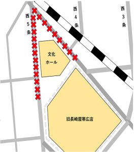 西5条通り及び文化ホール北側鉄南通り(×印地点)につきまして、駐車禁止となっております。
