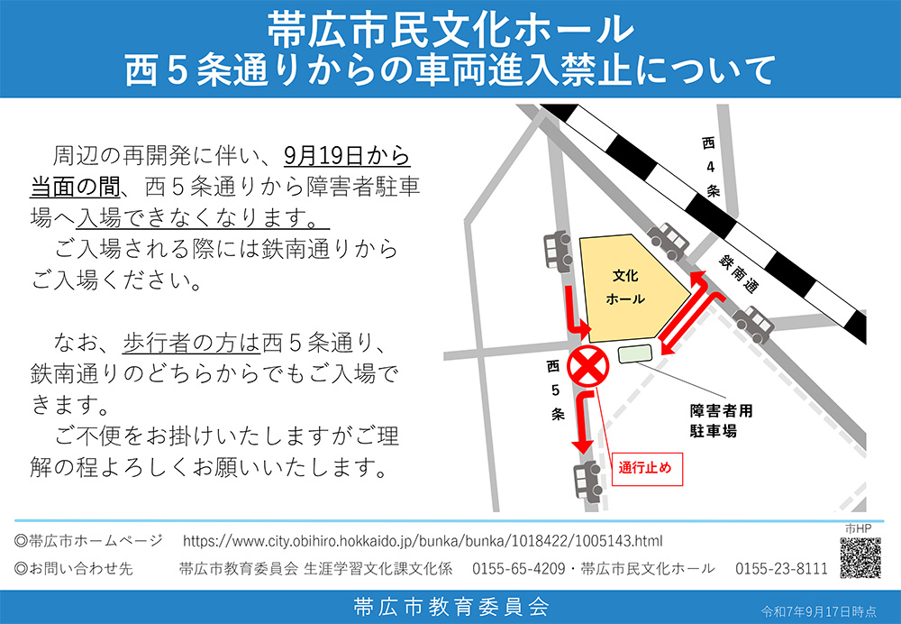 帯広市民文化ホール 西5条通りからの車両進入禁止について